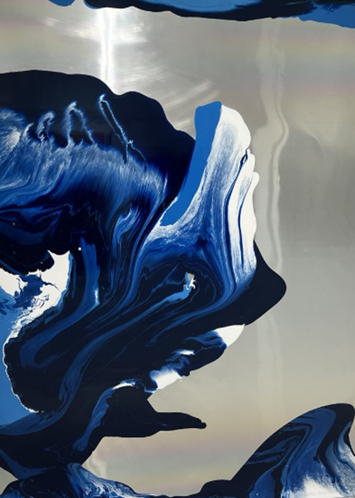 Blue condenses into a shifting mass, while white opens passages within it, not opposing but rearticulating its limits. The movement curves and returns, sustaining a balance that never stabilizes.